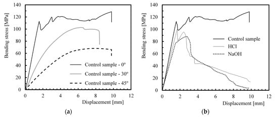 From Figure 1a, it is possible to observe a linear increase of the load with the displacement, followed by a nonlinear behaviour, wherein the maximum load is reached. For laminates with 0° oriented fibres, the fibre breakage is the main failure mode identified, and the posterior data zigzag corresponds to the initiation of delamination’s propagation. For the other orientations, the failure mode is essentially based on matrix and/or fibre/matrix interface degradations that are evidenced by smoother curves [51]. However, the high stress concentration in the pin load contact region should not be neglected in all failure mechanisms [52]. Similar behaviour is observed when the samples were exposed to the different hostile solutions, as shown in Figure 1b, for the composites with a fibre orientation of 0°, although the data showed lower values of maximum bending stress and flexural modulus. The quantitative results presented in Table 2 are the average values of these properties for all conditions analysed.