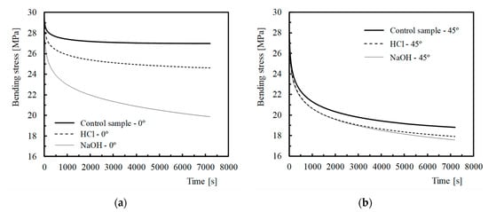 The sensitivity to hostile environments (acid and alkaline solutions) is shown in Figure 3 for the laminates with fibres at 0° and 45°. These curves plot the average bending stress versus time and are representative of all conditions analysed, where σ is the time-dependent bending stress and σ0 is the initial bending stress. Regardless of the hostile solution, the stress always decreased over time, but the decreases were higher for the exposed specimens than those observed for the corresponding control samples. Table 3 presents all the stress relaxation results, where Δσ is the ratio of the difference between initial and final stress.