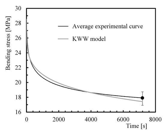 In Figure 2, it is also possible to identify an initial regime, in which the stress decreases considerably in relation to the remaining time [26,40,45,55]. For example, considering laminates with fibres at 0°, a decreasing around 8.7% occurred after 1000 s, while the remaining decrease was only 1.5%. These values were around 22.9% and 9.3% for the 30° fibre orientation and were 27.7% and 11% for the orientations at 45°, respectively.