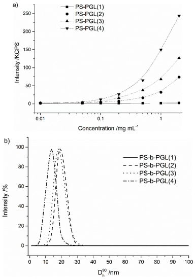 To carry out the micellization of PS-b-PGL(X) copolymers, samples were dissolved in dioxane at different concentrations. As for other micellization processes [46,47,48], the behaviour of PS-b-PGL(X) copolymers was followed by measuring the scattered light intensity of solution/dispersion as a function of copolymer concentration (Figure 1a).