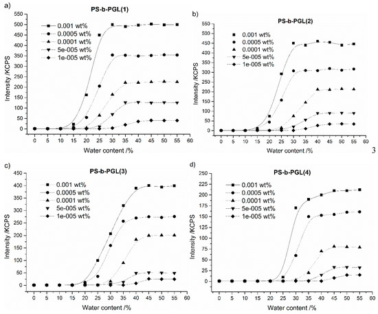 The scattered light intensity as a function of water content in the dioxane solution with various initial copolymer (a) PS-b-PGL(1), (b) PS-b-PGL(2), (c) PS-b-PGL(3), (d) PS-b-PGL(4) concentrations.