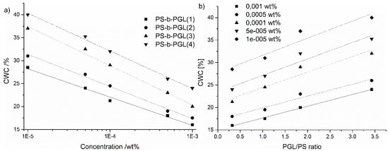 The relationship between the CWC and the initial concentration of copolymer in solution expressed in a logarithmic scale is shown in Figure 4a. The dependence could be approximated by straight lines for all the tested copolymers. Figure 4b shows plots of the CWCs of copolymer solutions as function of the length of the copolymers’ hydrophilic block. For a chosen initial concentration of the copolymers, CWC increases proportionally to the PGL/PS ratio. The straight lines are parallel for all studied initial concentrations. Similar relationships between CWC vs. initial concentration and CWC vs. copolymer block ratio were reported by Eisenberg et al. for a series of polystyrene-b-poly(acrylic acid) copolymers [5,9,10,11]. The decrease of CWC with increasing concentration of a polymer in the initial solution could be due to the lower amount of water necessary to cross the threshold at which aggregation begins to occur.