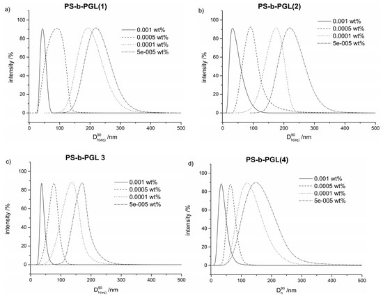 Particles size distributions for (a) PS-b-PGL(1), (b) PS-b-PGL(2), (c) PS-b-PGL(3), (d) PS-b-PGL(4) copolymers of various initial concentrations in dioxane/water 50/50 solution.
