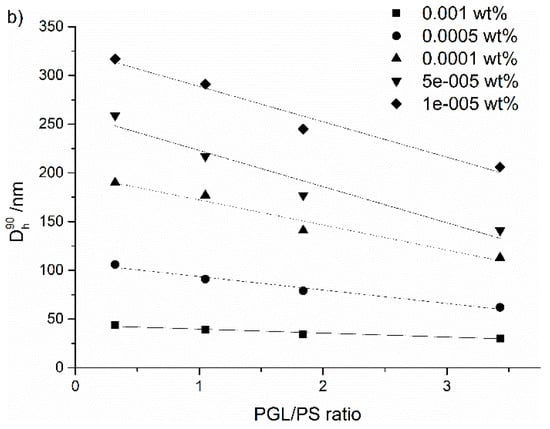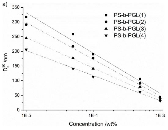 The Dh of particles exceeded 300 nm for PS-b-PGL, with 13 DP of polyglycidol block in case of the lowest initial concentration. For the highest studied initial copolymer concentrations, particles smaller than 50 nm were created from all investigated copolymers. Taking into account the contour length of copolymer chains (Table 2), it is highly probable that at this initial concentration, the copolymers with polyglycidol blocks longer than 13 units form regular core-shell micelles.
