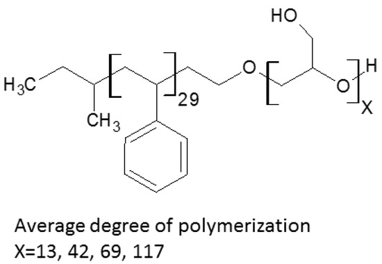 Polystyrene with –CH2CH2O−K+ end-groups and DP = 29 was used as the macroinitiator of glycidol polymerization. Four copolymers with the DP of the polyglycidol block equal to 13, 42, 69, and 117 were obtained. Information about PS-b-PGL copolymers used in this study are presented in Table 1. A detailed description of their polymerization and parameters was given in our previous work [43].
