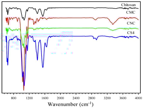 FTIR of CS, CMC, CNC, and CS4 samples.