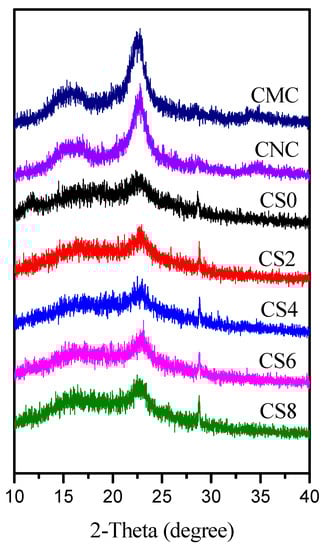 XRD of CMC, CNC CS0, CS2, CS4, CS6, and CS8 samples.