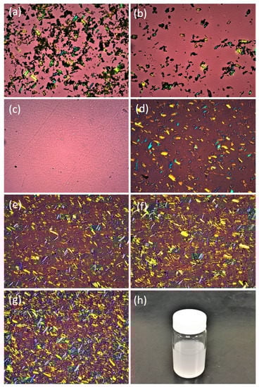 Optical microscope (OM) images of (a) CMC in powder form, (b) CNC in powder form, (c) CS0 film, (d) CS2 film, (e) CS4 film, (f) CS6 film, (g) CS8 film, and (h) digital image of water dispersed CNC.
