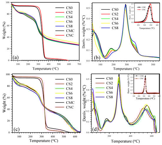 Thermal decomposition curves of CS0, CS2, CS4, CS6, CS8, CMC, and CNC: (a) and (b) N2 environment, and (c) and (d) air environment.