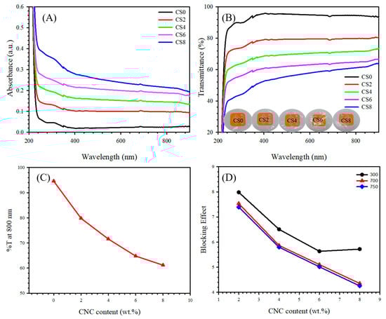 (A) UV absorption curve, (B) UV transmittance curve, (C) optical percentage transmittance (%T) of UV at 800 nm, and (D) blocking effect of UV at different wavelengths for CS0, CS2, CS4, CS6, and CS8 films. Inset of Figure (B): digital image of fabricated films.