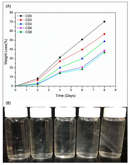 The FWS values of CS0, CS2, CS4, CS6, and CS8 films were 35.70, 33.85, 31.91, 28.20, and 26.55, respectively. As shown in Table 1, the FWS of the samples decreased from 35.70 to 26.55 with increasing CNC loading (0–8 wt.%). This phenomenon can be explained on the basis of 3D network structure of CNC, which protected the movement of polymers to water, resulting in the reduced FWS of the samples [58,61].