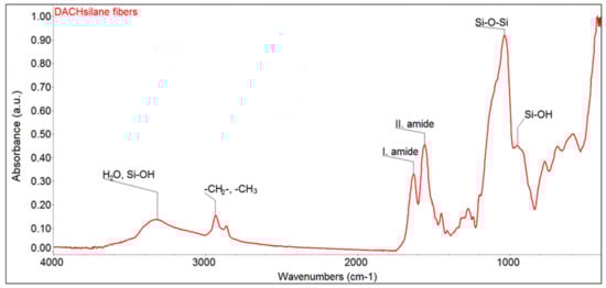 FTIR spectrometry was used to assess the chemical structure of the prepared hybrid DACHsilane fibres. FTIR Spectrometer Nicolet iZ10 (Thermo Fisher Scientific, Waltham, MA, USA) with an attenuated total reflection (ATR) diamond crystal angle of 45°, and a spectral range of 4000–700 cm−1 was used for the analysis. The number of sample scans: 16, number of background scans: 32, resolution: 4 cm−1, gain: 4.0, apodisation: Happ–Genzel, correction: Atmospheric suppression, baseline.