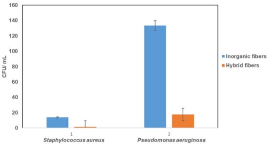 The results related to the antibacterial activity in the solution were examined by calculating the bacterial cell growth reduction (CGR %) using Gram-positive bacteria S. aureus and Gram-negative bacteria P. aeruginosa. Figure 5 shows visible differences between the purely inorganic and hybrid DACHsilane fibres. The examined hybrid fibrous samples seemed to show significant antibacterial activity compared to the control and standard inorganic fibrous samples (Table S1, Figures S3–S5 in the Supplement). The antibacterial activity of the purely SiO2 fibrous material was significantly less compared to the tested hybrid fibrous material. Better results were observed against S. aureus with 91% antibacterial activity than against P. aeruginosa, where the antibacterial activity reached only 87%. When we compare these results to the control for cell bacterial growth (Figure S3), the inhibition activity for both bacterial strains is even higher than 99.9%, which is in close agreement with the recent literature []. The results obtained from this experiment (Figure 5) closely correspond to the bacterial adhesion test mentioned below, where P. aeruginosa has a higher tendency to adhere to the surface of the hybrid fibrous sample compared to S. aureus.