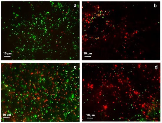The bacterial adhesion of S. aureus and P. aeruginosa on the surface of each fibrous sample was evaluated according to the reported literature []. Several changes, appearing during the experiment, are mentioned below. The prepared samples were incubated in the bacterial solutions at the initial optical cell density (0.15 ± 0.08/600 nm) for 1 h at 37 °C. Subsequently, the samples were rinsed twice with distilled water, put on glass slides and covered with a Live/Dead Backlight, 1 Kit 30× diluted solution containing (1.67 mM of SYTO9—A and 18.3 mM propidium iodide—B, molar ratio 1:1). The samples were kept in the dark for 15 min and further analysed at 630 nm using the filters 44 fluorescein isothiocyanate (FITC) (green) and 43 cy3 (red). The live and dead bacteria (S. aureus and P. aeruginosa) attached to the surface of the samples were imaged using a fluorescent microscope (ZEISS Axio Imager 2, Jena, Germany).