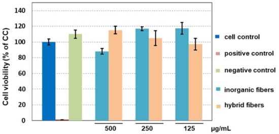 The cell viability assay performed on 3T3-A31 murine fibroblasts proved the cytocompatibility of the hybrid DACHsilane fibres in all three tested concentrations due to the viability highly exceeding the 70% CC level. As shown in Figure 7, exposure to the DACHsilane fibre extract led to increased cell viability in the case of the 500 µg/mL and 250 µg/mL extracts. The DACHsilane extracts had a concentration-dependent effect on cells as an increase in the extract concentration led to an increase in the cell viability from 97.2 ± 7.3% (125 µg/mL) up to 115.1 ± 4.9% (500 µg/mL). This led us to believe that the degradation products of the DACHsilane fibres are favouring cell proliferation. This effect was also observed with the inorganic silica dioxide nanofibres but in lower concentrations below 250 µg/mL (Figure 7). These findings were supported by a cell morphology analysis (see Figure S6 in the Supplement).