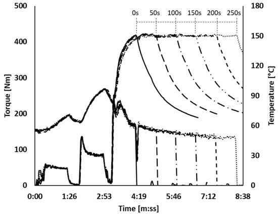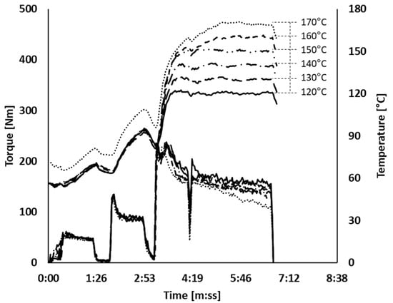 All series of experiments were done based on a tire tread compound as shown in Table 1. Two basic mixing procedures A and B were employed: procedure A to emphasize the effect of silanization temperature and procedure B to emphasize the effect of silanization time. The compounds were mixed in two steps as shown in Table 2 and Table 3. The master batch stage was done using a lab-scale internal mixer (Brabender Plasticorder, Brabender GmbH & Co KG, Duisburg, Germany) with 390 mL of chamber volume. The fill factor of the internal mixer was fixed to 63%. The temperature of the mixer temperature control unit (TCU) was set at 50 °C, except for the silanization temperature mixing test at 170 °C, where 70 °C of TCU temperature was applied for this test to reach 170 °C. In order to avoid the “first batch effect”, one initial batch was mixed and discarded before the regular mixing started. The regular mixing was started when the mixing chamber reached 55 °C. The mixing fingerprints are depicted in Figure 1 and Figure 2. In the case of mixing procedure A, the rotor speed was adjusted from 4:10 (minutes/seconds) onwards in order to reach and subsequently keep different silanization temperatures steady during a period of silanization of 150 s. The same temperature control technique was used for mixing procedure B, but here the silanization temperature was fixed at 150 °C and the silanization period varied. After the first mixing step, the compounds were sheeted out immediately on a lab-scale two-roll mill (Polymix 80 T, Servitec GmbH, Wustermark, Germany) in order to cool down the compounds and prevent further reaction. Three batches were mixed for each set of conditions in order to check the reproducibility. All batches were mixed with good reproducibility.