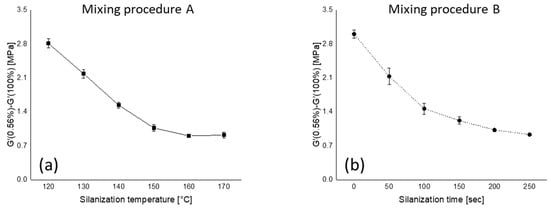 The Payne effect of the uncured compounds is plotted as a function of the silanization temperature and time for both mixing procedures, as shown in Figure 3. With increasing silanization temperature and time, a lower Payne effect value is observed due to a higher degree of silanization.