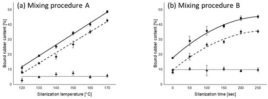Figure 4 shows the amount of bound rubber as a function of silanization temperature (mixing procedure A) and silanization time (mixing procedure B). Mixing condition (150 °C and 150 s) in both mixing procedures A and B was used as a reference silanization step. The bound rubber values corresponding to the reference silanization condition in Figure 4a,b show some differences. However, admittedly, the accuracy of the values of bound rubber tests is limited. When the actual values (Table 4) and the possible tolerance scale of the bound rubber evaluation (±5%) are taken into account, it can be stated that the values of the bound rubber corresponding to the reference silanization condition in Figure 4a,b are within the tolerance range.