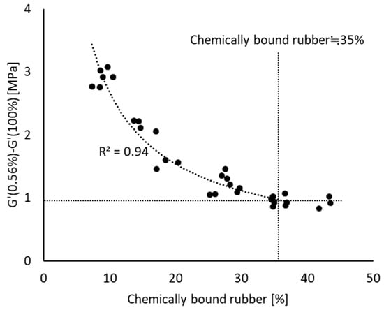 Payne effect vs. chemically bound rubber content; fitting line is based on polynomial fit with maximum R2.