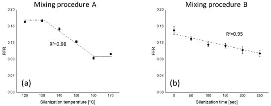 In our previous work, it was already reported that the FFR has an upper limit []. However, in the present work, mixing procedure A shows two plateau regions—one for a silanization temperature lower than 130 °C and one for temperatures higher than 160 °C. This indicates that the FFR has an upper and lower limit; in this compound, an upper limit of 0.17 and a lower limit of 0.09 was found. In the case of mixing procedure B, no upper and lower limits are observed because the range of FFR values was within those limits of FFR.