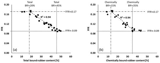 FFR vs. bound rubber content: (a) FFR vs. total bound rubber and (b) FFR vs. chemically bound rubber; (