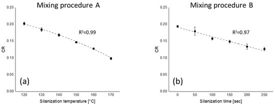 The filler–polymer coupling rates (CRs) of all mixing series are shown in Figure 8. The CRs of the compounds plotted as a function of the silanization temperature and time show a decreasing trend with temperature and time. Similar to the FFR results, the difference of CR for mixing procedure B is smaller than for mixing procedure A—silanization temperature has more effect on the filler–polymer coupling reaction than silanization time.
