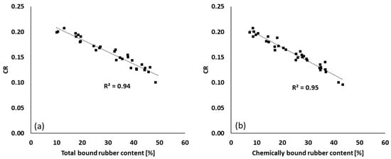 CR vs. bound rubber content: (a) CR vs. total bound rubber and (b) CR vs. chemically bound rubber; fitting lines for (a,b) are based on linear fit with maximum R2.