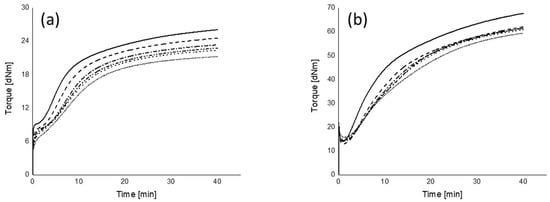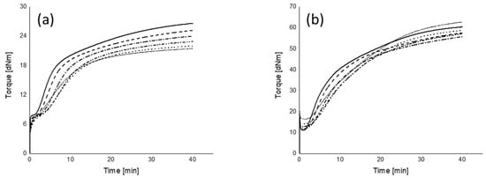 The consequence of an incomplete silanization is a marching modulus during the vulcanization stage of such compounds []. Marching modulus during vulcametry is a problem often observed in silica-filled solution styrene–butadiene rubber/butadiene rubber (S-SBR/BR) tire tread compounds. From an industrial standpoint, this phenomenon makes it difficult to determine the optimum curing time, tc,90 or tc,95, from a rheogram. It is neither productive nor efficient to wait for a prolonged time in order to obtain a plateau in the vulcanization profile. Therefore, the marching modulus phenomenon should be avoided or at least minimized.
