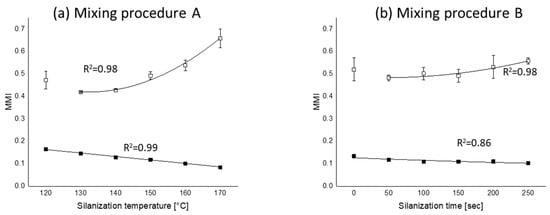 Marching modulus intensity (MMI) as a function of silanization temperature and time: (a) MMI vs. silanization temperatures and (b) MMI vs. silanization time; (