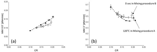 Not only the FFR but also the CR is important for the MMI 0.5° and MMI 3°. In Figure 14, both MMIs are plotted as a function of CR. A higher silanization temperature and a longer silanization time lead to a higher amount of bound rubber and indicate a lower concentration of free silane and released free sulfur from TESPT. As a consequence, a slower and lower degree of the coupling reaction occurs during the vulcanization process. Finally, a lower torque level and corresponding flat plateau of the rheograms is obtained when the rheometer runs at small strains, approximately 7% (~0.5°). In the case of large strain, approximately 42% (~3°), a rapid rise of the rheometer torque can be seen in the compound, which was mixed at a lower silanization temperature or a shorter silanization time, due to a faster filler–polymer coupling reaction; a relatively large amount free silane and free sulfur remains within the compound. These results again show that the shielding of the filler surface not only by a silane coupling agent but also by bound rubber does strongly affect the rheometer torque.