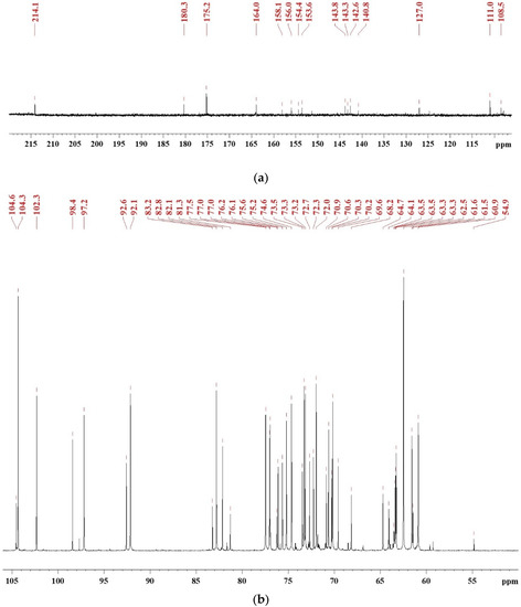 13C NMR spectrum of freeze-dried SADP adhesive in DMSO-d6: (a) chemical shifts in the region of 220–106 ppm and (b) the chemical shifts in the region of 106–50 ppm.
