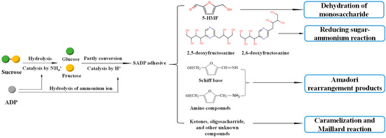 The proposed synthesis mechanism is shown in Figure 2, which shows that the synthesis of the SADP adhesive is a complex reaction. During heat treatment, ammonium catalyzed the hydrolysis of sucrose to glucose and fructose, and the ammonium ion from ADP also was hydrolyzed to ammonium hydroxide [40]. Some of the liberated hexoses were converted to 5-HMF, and some of the 5-HMF reacted with ammonium hydroxide and formed amino compounds and Schiff base via an Amadori rearrangement. In addition, 2,5-DOF and 2,6-DOF were formed from the reaction of a reducing sugar and ammonium [41]. The ketones, oligosaccharides, and other unknown compounds were also present in the synthesized SADP adhesive, and their formation occurred via caramelization and Maillard reactions [42,43].