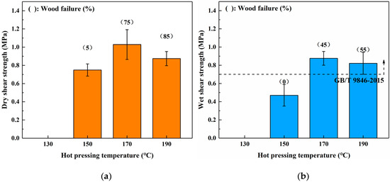 Effects of hot pressing temperature on the bond performance of plywood: (a) dry shear strength and (b) wet shear strength.