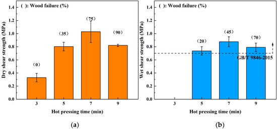 Effects of hot pressing time on the bond performance of plywood: (a) dry shear strength and (b) wet shear strength.