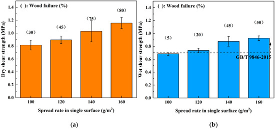 Effects of spread rate in single surface on the bond performance of plywood: (a) dry shear strength and (b) wet shear strength.
