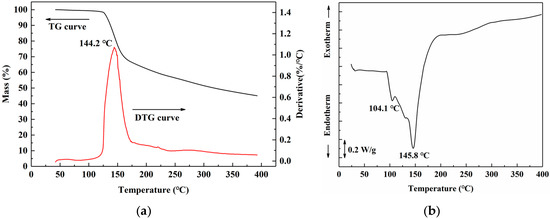 (a) Thermo gravimetric (TG) and derivative thermo gravimetry (DTG) curves, and (b) differential scanning calorimetry (DSC) curve of SADP adhesive.