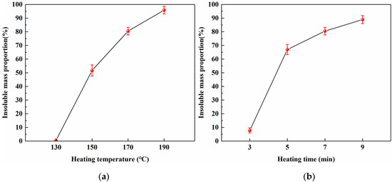 Effects of (a) heating temperature and (b) heating time on the insoluble mass proportion.