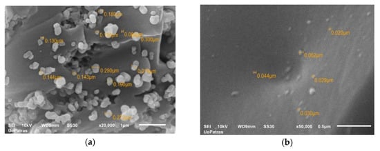 The surface topography of micro- and nano-epoxy/TiO2 composites can be observed through scanning electron microscopy, in Figure 1a,b. The SEM image presented in Figure 1a corresponds to the highest TiO2 microparticles weight fraction (20 wt.%). As far as microparticles are concerned, the formation of aggregates can be detected, since this is the maximum weight fraction, above which TiO2 microparticle aggregation is inevitable. As the markers on the image indicate, the size of the particles varies from 0.13 μm to 0.3 μm.