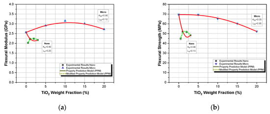 Finally, it is evident from both Figure 6a,b that the Property Prediction Model (PPM) predicts extremely well the variation of the flexural modulus as well as of flexural strength as a function of the filler–weight fraction, for TiO2 microcomposites, with minimal deviations.