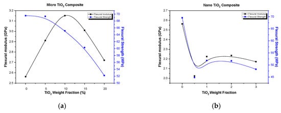 In Figure 3, a comparison of the between flexural modulus and flexural strength variation vs. filler–weight fraction for micro- and nanocomposites is presented. As shown in Figure 3a, a continuous decrease in flexural strength of the composite is observed, as the micro-filler weight fraction is increased. This is a commonly observed behavior attributed to the voids, impurities, and particle aggregates developed due to the addition of particles. All the above-mentioned initiate micro-cracks and promote initiation of crack propagation, which inevitably reduces the flexural strength of the TiO2 microcomposites manufactured. From the same figure, we can observe a totally different way of variation between the modulus and the strength with filler concentration.
