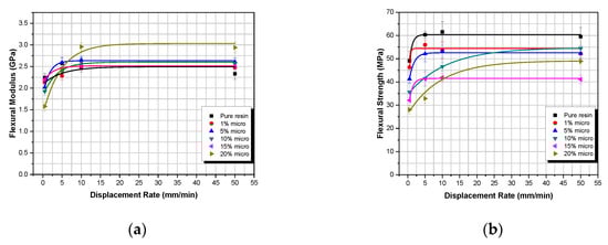 As shown in Figure 4a,b, both flexural modulus and flexural strength in micro-particulate TiO2 composites show an initial increase with displacement-rate, until they both reach a plateau at the threshold displacement-rate of 5 mm/min. This can be attributed to inertia phenomena []. More precisely, as the displacement-rate increases, the TiO2 composite materials manufactured are unable to absorb the whole energy provided to them, so that both the flexural modulus and flexural strength reach their respective plateau (maximum values).