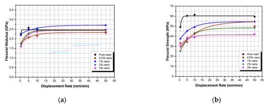 In Figure 5, the same behavior is observed as in Figure 4 for the TiO2 nano-particulate composites. As the displacement-rate is increasing, the flexural modulus and the flexural strength are also increasing until they reach a certain plateau. However, for the nanocomposites, the displacement-rate threshold is now located at 10 mm/min.