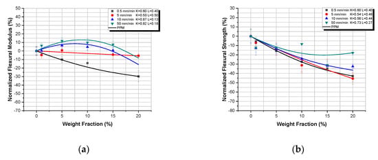 As shown in Figure 2a, the model predicts extremely well the variation of the flexural modulus as a function of the filler–weight fraction, for TiO2 microcomposites and sufficiently good for TiO2 nanocomposites. In the case of microcomposites, as the filler–weight fraction increases, an initial increase in flexural modulus is observed, and this is attributed to the matrix reinforcement provided by the TiO2 microparticles. However, with further increase in filler–weight fraction, and for weight fractions higher than 10%, a decrease in flexural modulus is detected. The observed decrease in flexural modulus is attributed to the formation of agglomerations that are visible in Figure 1a.