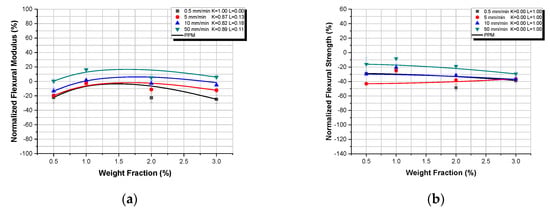 TiO2-Epoxy nanocomposites: Normalized flexural properties versus TiO2 weight fraction and respective property prediction model (PPM) predictions, for different displacement-rates: (a) normalized flexural modulus; (b) normalized flexural strength.