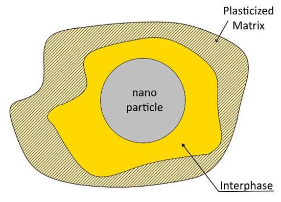 Now, concerning respective Property Prediction Model (PPM) predictions, it is obvious from both figures that a fair agreement between experimental values and respective predictions was achieved. However, it must be pointed out that, for the above prediction, the matrix plastification effect has been always considered, according to which even with the addition of a very small amount of nano-fillers, matrix mechanical properties are abruptly reduced rendering the matrix material to behave differently when compared to the virgin one. Thus, according to these findings, one should take into account this phenomenon when studying epoxy–matrix nanocomposites with particle diameters smaller than 20 nm, taking as matrix properties those corresponding to the nanocomposites reinforced by an amount of 0.5 wt.% of filler and not those corresponding to the virgin material. These observations confirm the fact that resins behave differently as composite matrices and as a virgin material. The main reason for such a behavior is the existence of an interphase material created in the region at the close vicinity of each particle, with intermediate properties between those of the matrix material and the reinforcement. These properties are gradually varied from those of the inclusion to those of the matrix. The extent of such an interphase, depends not only on the nature of the constituent materials, but also on the filler fraction and the property studied at the time (Figure 8). Especially in the case of nanocomposites, due to the high filler–matrix contact area, almost all of the matrix material is transformed into “modified matrix”; i.e., interphasial material [,,,,].