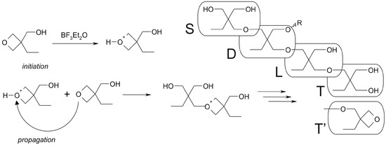 Poly(3-ethyl-3-hydroxymethyloxetane)s can be synthesized according to cationic, anionic or activated monomer mechanisms [1,2,13,15,38,39]. In the case of cationic polymerization, the catalyst concentration and temperature have fundamental impacts on the degree of the branching of the obtained product. Figure 1 shows the mechanism of the reaction and the possible substructures of the polymer. In the structure that was synthesized with the use of trimethylolpropane (TMP) as an initiator and EHO as a monomer, the starting (S) and terminal (T) units were identical, which simplified the NMR spectra (Figure 2). Other units present in the polymer were dendritic ones (D) in which all hydroxyl groups reacted; linear ones (L), with one free OH group; and terminal cyclic ones (T’).