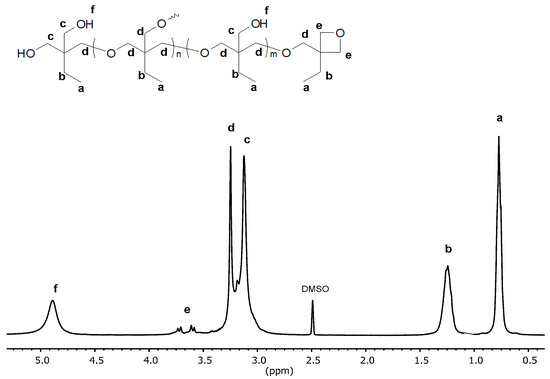 Figure 2 shows a typical 1H NMR spectrum of hyperbranched poly(3-ethyl-3-hydroxymethyloxetane) measured in DMSO-d6. All the signals can be assigned to the structural elements of the polymer: –OH (4.7 ppm), −CH2−O−(T’) (3.7–3.6 ppm), −CH2−O−(3.3 ppm), −CH2−OH (3.1 ppm), −CH2−CH3 (1.3 ppm), and −CH2−CH3 (0.8 ppm). The doublet of doublets (e) at 3.7 ppm indicates the presence of terminal units T’ (Figure 1) and was visible only for the polymers synthesized at low temperatures.