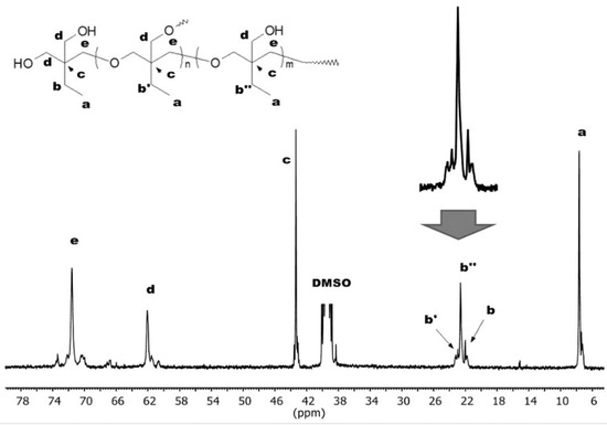 The degree of branching of the hyperbranched polyoxetanes was determined with the use of b signals (Figure 3) in the 13C NMR spectrum. The signal of the methylene group carbon of the ethyl substituent was split according to the chemical surrounding into signals of dendritic (b’’), linear (b’) and terminal (b) units. It was deconvoluted and integrated by using MestReNova 10.0.2-15465 software (Mestrelab Research, S.L., Escondido, CA, USA).