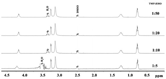Theoretical macromolecule weight and size are determined by the amounts and structure of used reagents—the monomer to core ratio. In practice, thstatistical nature of polymerization yields a mixture of products of various shapes, branching degrees and molar masses [42]. The molar mass and dispersity of the synthesized polymers are presented in Table 2. One can see that dispersity grew with the growth of the TMP/EHO ratio. This is in agreement with the nature of the ring-opening multibranch polymerization reaction [14,43]. The table does not show a clear relationship between the theoretical and observed values of the number-average (Mn) and weight-average (Mw) molar mass. This is not surprising because the GPC technique is considered to be error-burden when using polystyrene as the internal standard, because polystyrene’s hydrodynamic radius is different from that of the POX. Difficulties in the reliable determination of true average molar mass of hyperbranched polymers by GPC have been described in the literature [44,45,46].