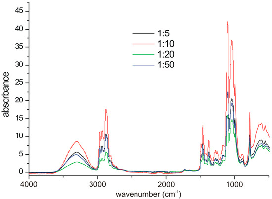 No relationship between the reagents ratio in the POX and peak intensities could be seen, because the FTIR measurements were qualitative. On the other hand, it is clear that respective bands in the spectra of 1:5–1:50 occurred at identical wavenumbers, thus proving great similarity in their structures.